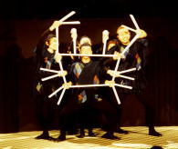 | 演劇鑑賞教室ではなく、新しく設けられた〈総合学習〉の時間に 『あとむの時間はアンデルセン』(遊びのヴァージョン)が 6月7日、松本市の田川小学校に招かれました。 1年生から3年生までと、その保護者と地域の老人たちが 交流しアニメイム(棒とボールと輪っかで遊ぶもの・右の写真) に参加し遊びアンデルセン童話≠鑑賞するものでした。 |